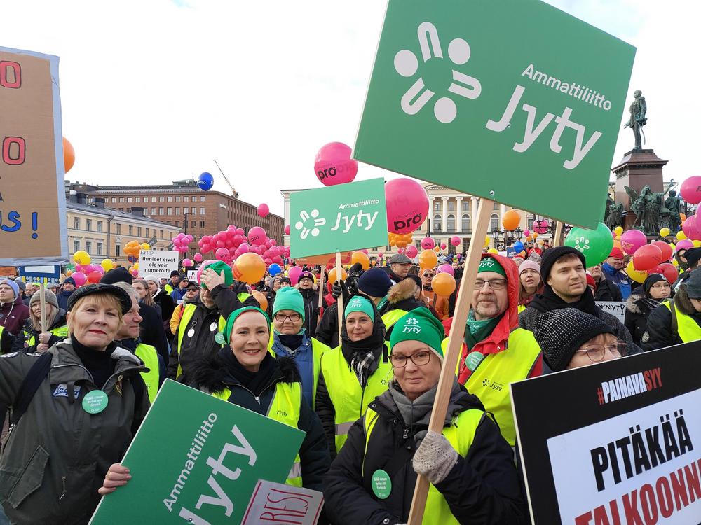 "Mielenosoitus kokosi yhteen jopa 13 000 osallistujaa ympäri Suomea. Tilaisuudessa pääsivät ääneen liittopuheenjohtajat, mukaan lukien Jytyn Jonna Voima. Jyty-ämpärin kanssa lavalle tullut Voima kertoi haluavansa antaa hallitukselle ämpärillisen jäitä hattuun." -Ammattiliitto Jyty