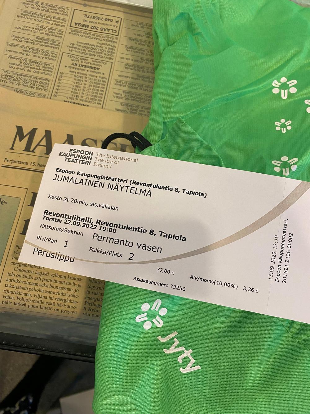 Kävimme syksyn avaustapahtumassa katsomassa Espoon kaupunginteatterissa Jumalaisen näytelmän. Ohjaaja Juha Hurmeen ote jäi varmasti kaikkien mukana olleiden mieleen.